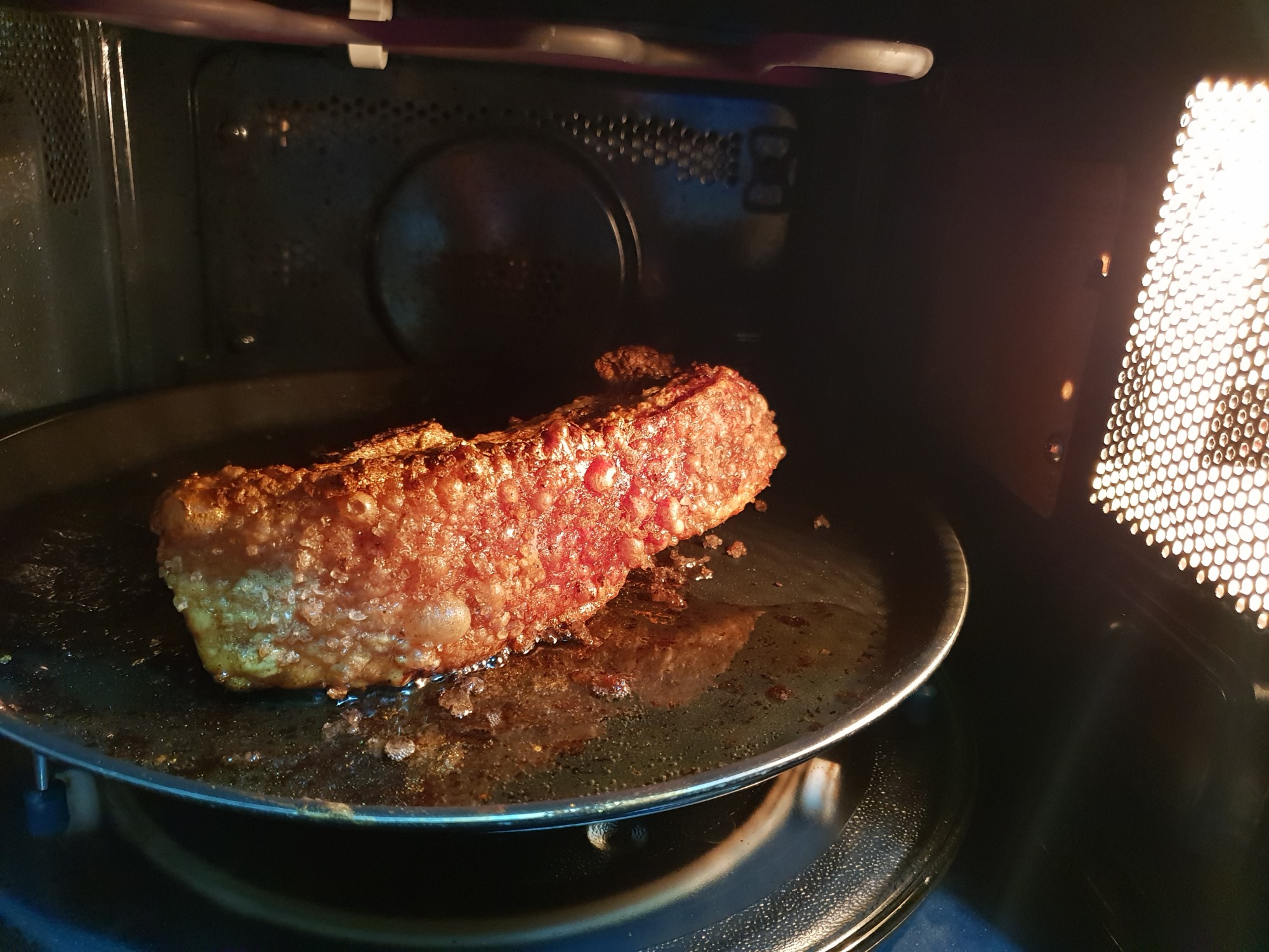 The meat sat in the oven for 50 minutes at 200 degrees celsius, had its skin pierced, and then a further 10 minutes under the grill strip.
