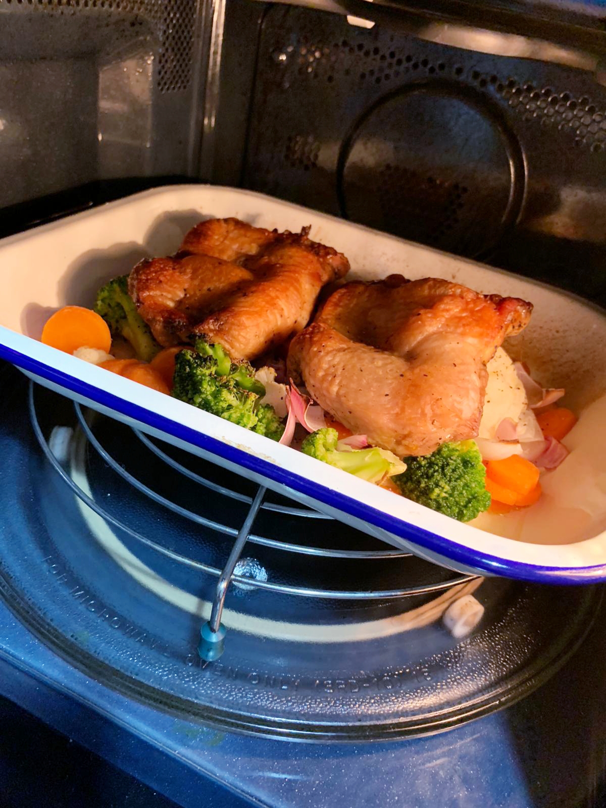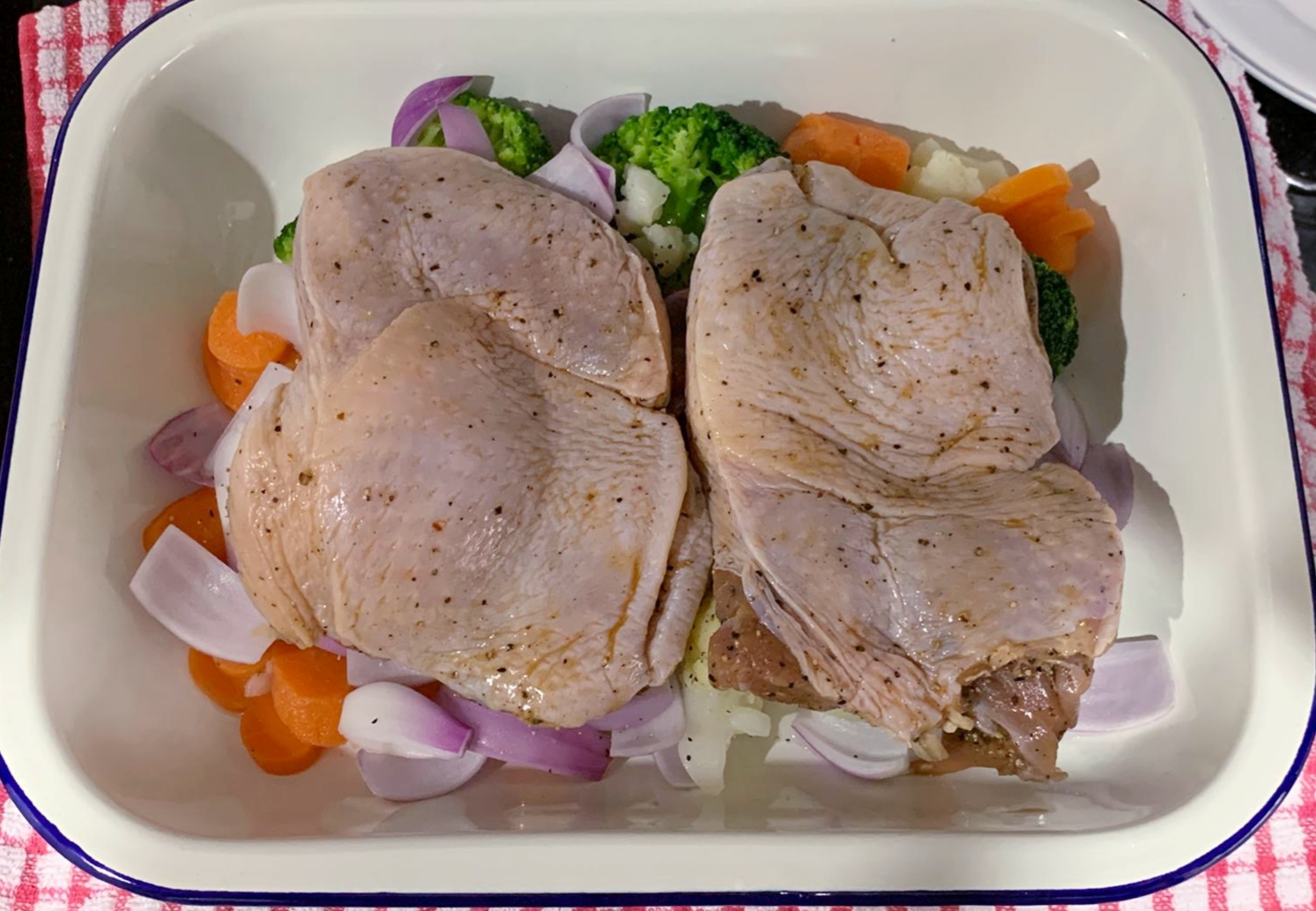 I heated the oven to 200°C, and prepped the bed of root vegetables, sprinkled some ground black pepper, and laid the chicken on top so the goodness would seep into the vegetables.